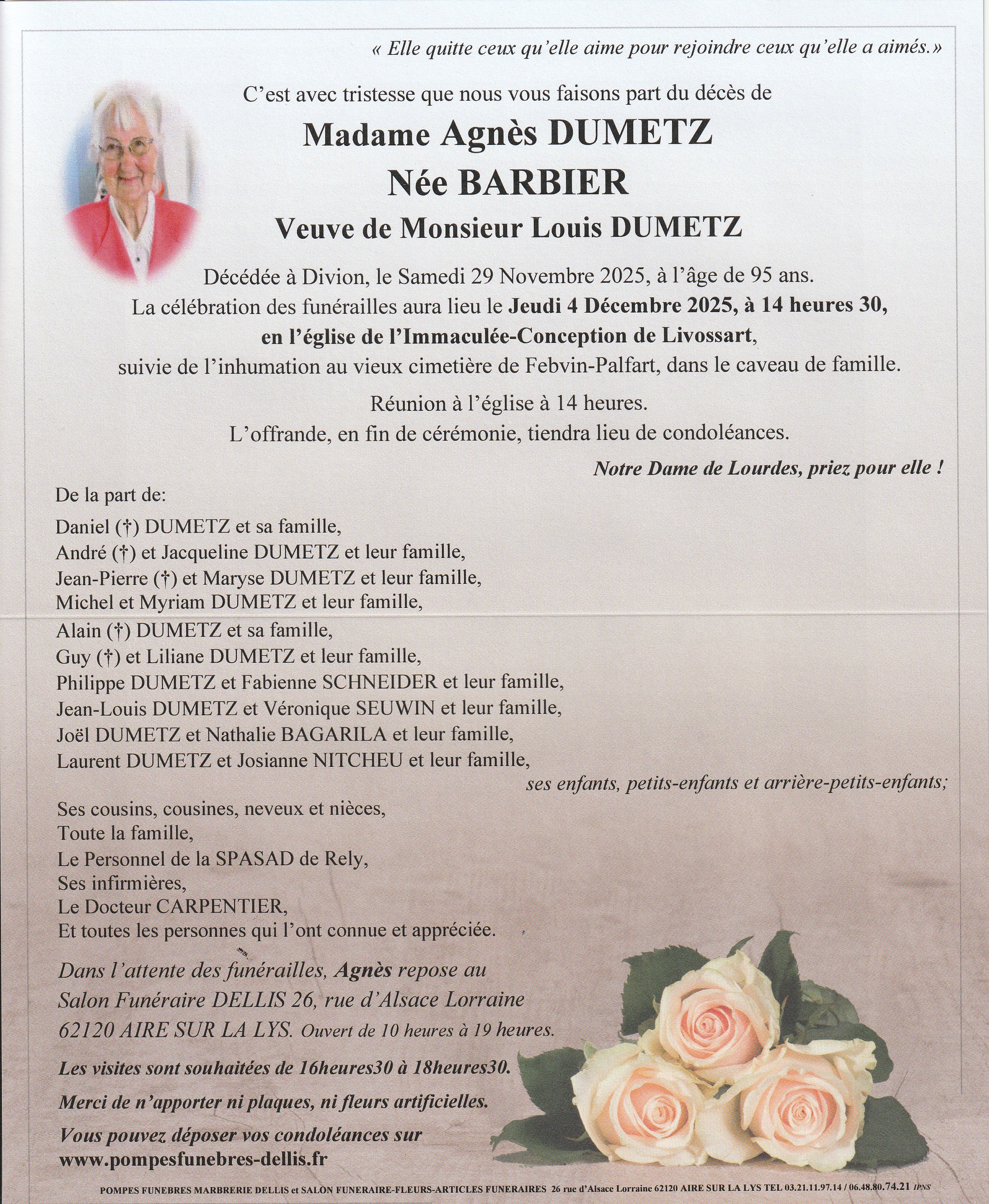 C’est avec une grande tristesse que nous vous annonçons le décès d’Agnès DUMETZ survenu le samedi 29 novembre 2025 à Divion. La cérémonie se déroulera le jeudi 04 décembre 2025 à 14h30 à l’adresse suivante : Église Immaculée Conception À Livossart - rue de fauquembergues à LIVOSSART - 62960 Febvin-Palfart.