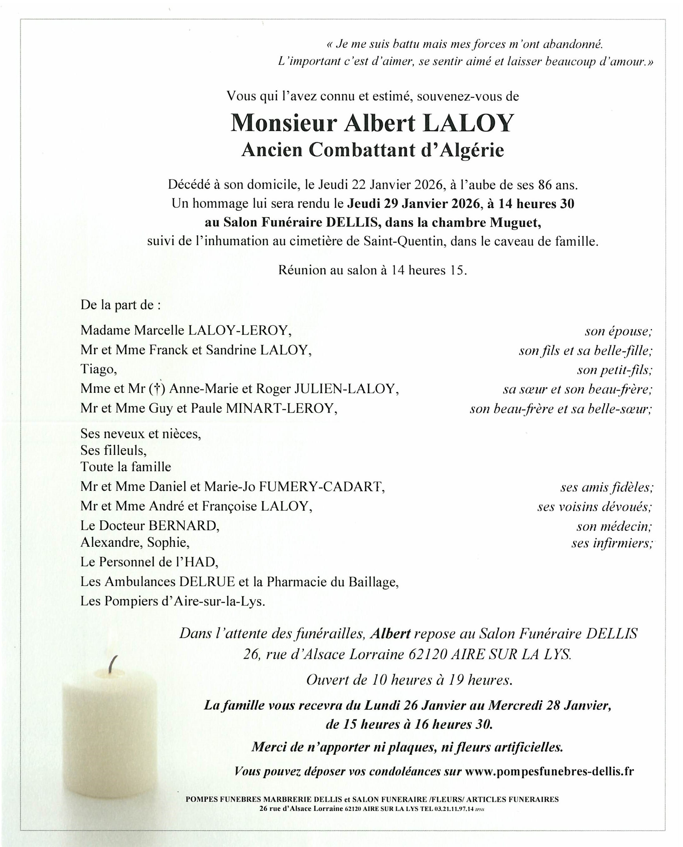 C’est avec une grande tristesse que nous vous annonçons le décès d’Albert LALOY survenu le jeudi 22 janvier 2026 à Aire-sur-la-Lys. La cérémonie se déroulera le jeudi 29 janvier 2026 à 14h30 à l’adresse suivante : Chambre Funéraire Dellis - 26 Rue d'Alsace Lorraine - 62120 Aire-sur-la-Lys.
