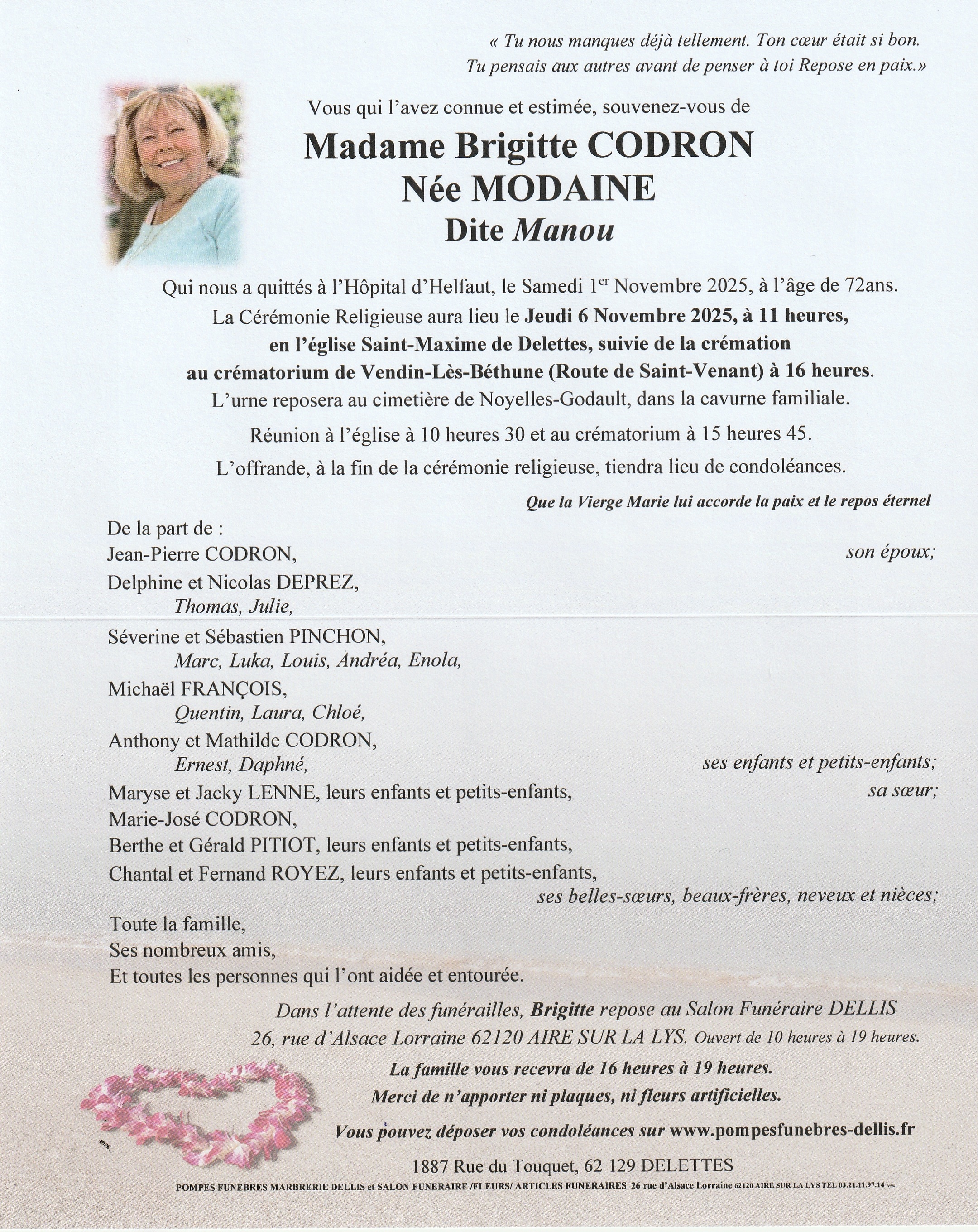 Brigitte CODRON 1953 - 2025 Marie Agnès Aujourd’hui, c’est un jour difficile car je dois te dire au revoir alors que je t’aimais tant. Les années passent, je me disais que j'avais une marraine exceptionnelle, gentille, toujours attentionnée. Quelle tristesse pour moi, tu me manqueras énormément, je ne t'oublierai jamais. Au revoir Marraine. Lucas Morel Devant ce douloureux coup du sort, je suis à la fois triste et décontenancée. Je voudrais vous apporter un peu de réconfort, mais, aujourd’hui les mots me manquent. Anaïs Henri Toutes mes pensées affectueuses à vous, qui m’avez fait aimer les mathématiques. Votre gentillesse, votre pédagogie envers nous restera gravé comme un précieux souvenir de mon enfance. Vous avez marqué ma vie bien au-delà de la salle de classe. Reposez en paix.