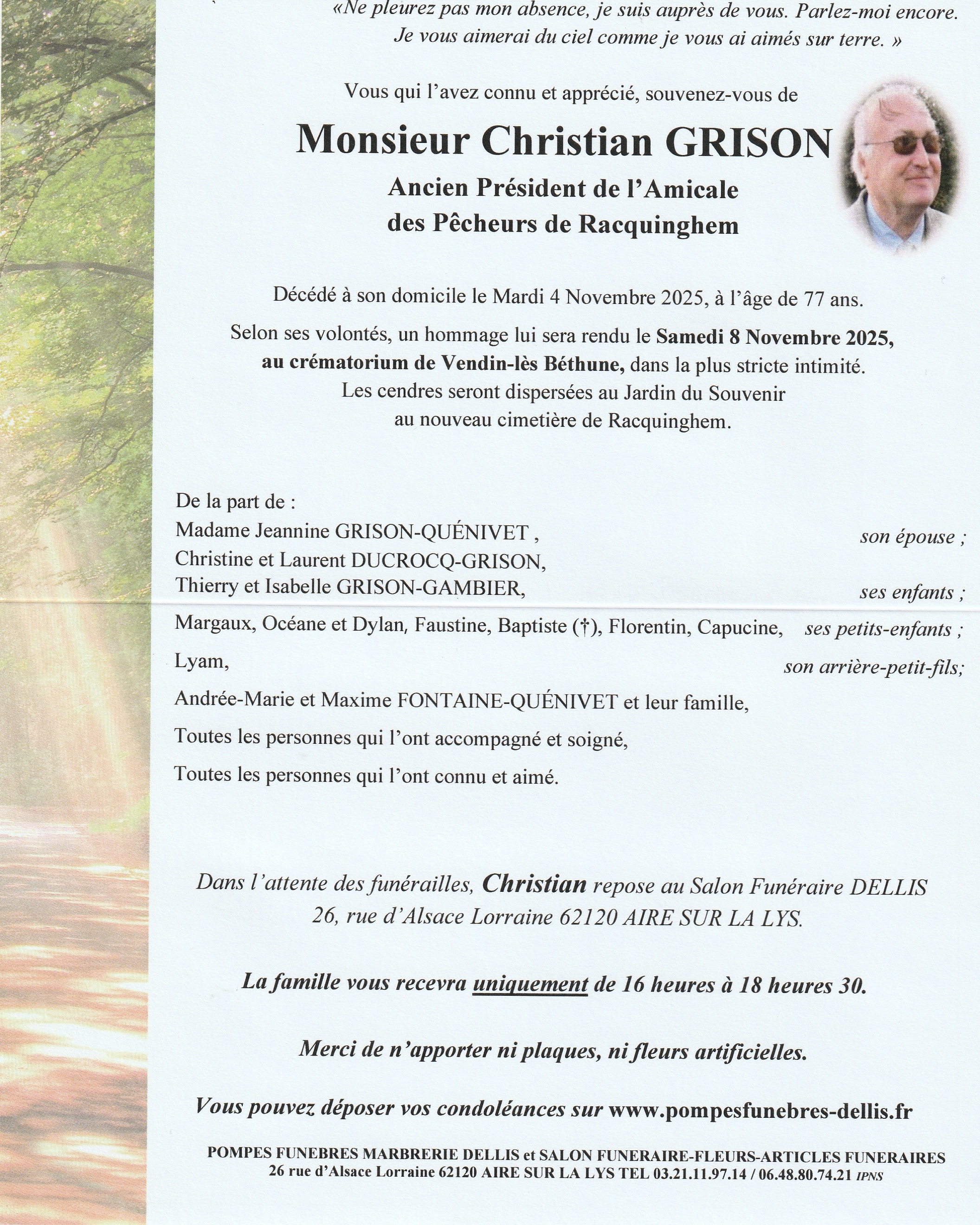 C’est avec une grande tristesse que nous vous annonçons le décès de Christian GRISON survenu le mardi 04 novembre 2025 à Racquinghem. La cérémonie se déroulera dans l'intimité familiale.