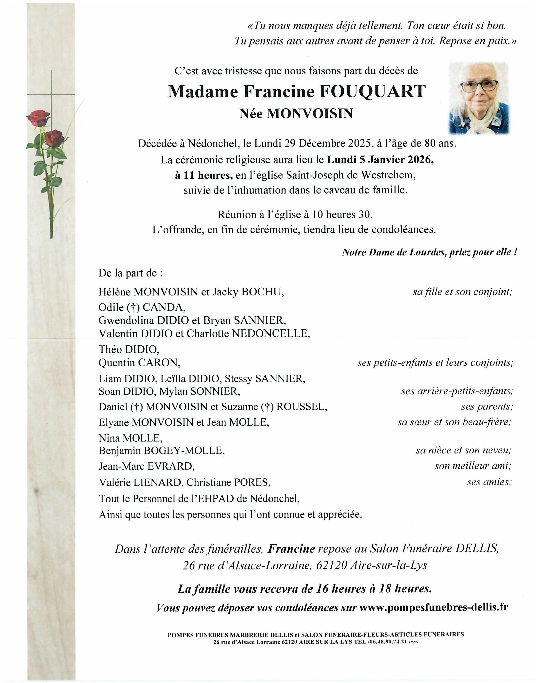 C’est avec une grande tristesse que nous vous annonçons le décès de Francine FOUQUART survenu le lundi 29 décembre 2025 à Nedonchel.