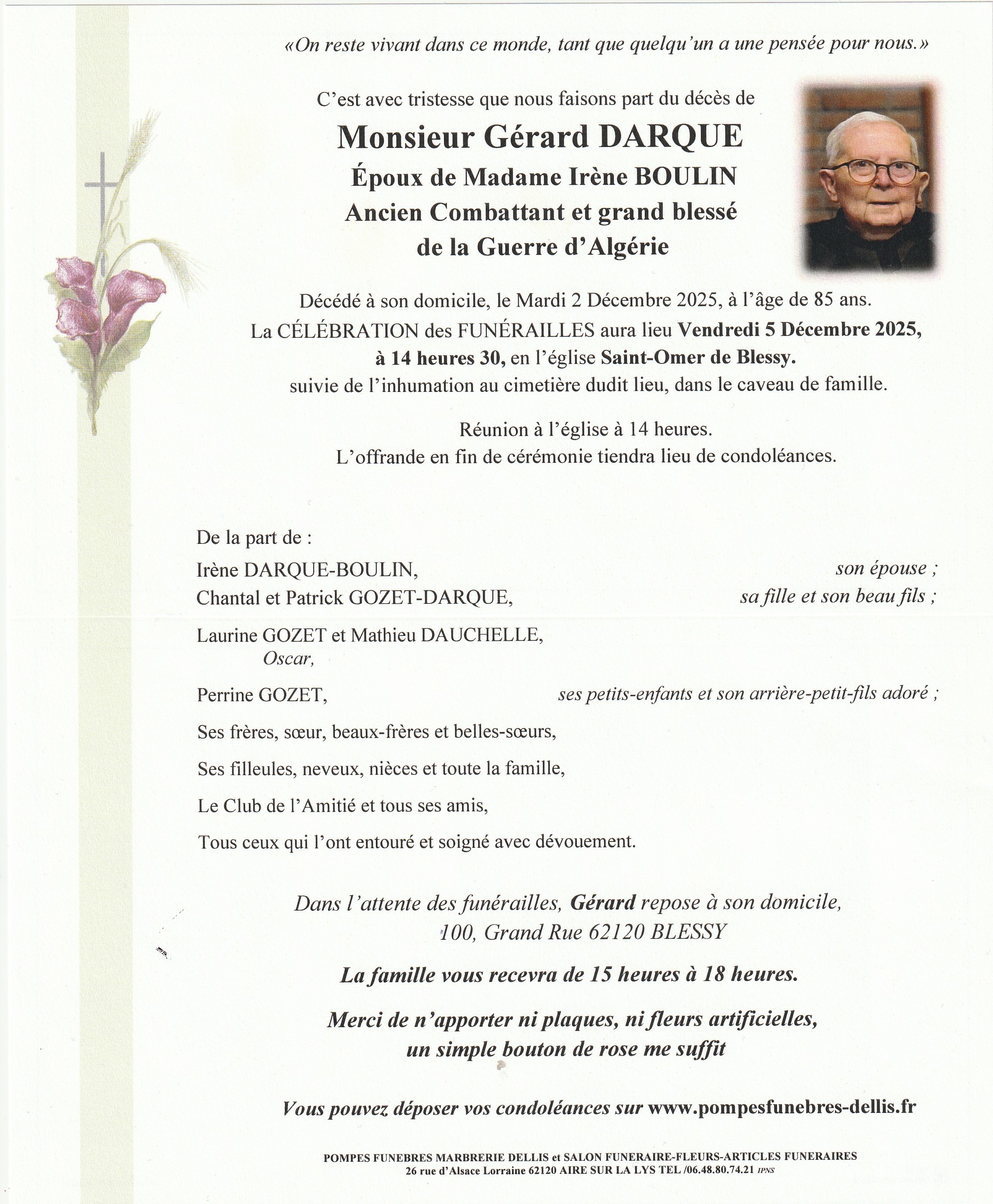 C’est avec une grande tristesse que nous vous annonçons le décès de Gérard DARQUE survenu le mardi 02 décembre 2025 à Blessy. La cérémonie se déroulera le vendredi 05 décembre 2025 à 14h30 à l’adresse suivante : Église Saint Omer - 62120 Blessy.