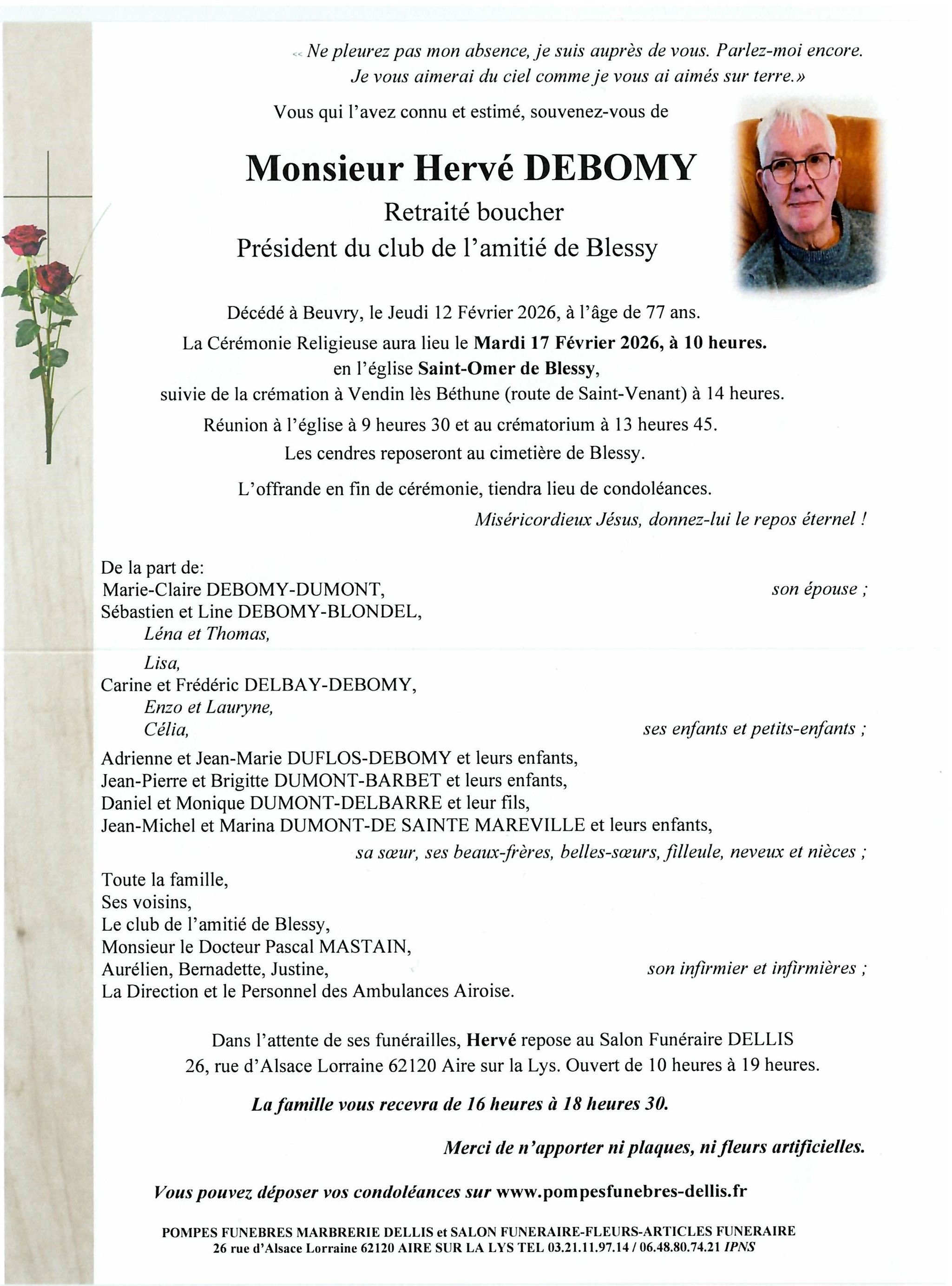 C’est avec une grande tristesse que nous vous annonçons le décès d’Hervé DEBOMY survenu le jeudi 12 février 2026 à Beuvry. La cérémonie se déroulera le mardi 17 février 2026 à 10h00 à l’adresse suivante : Église Saint Omer - 62120 Blessy.