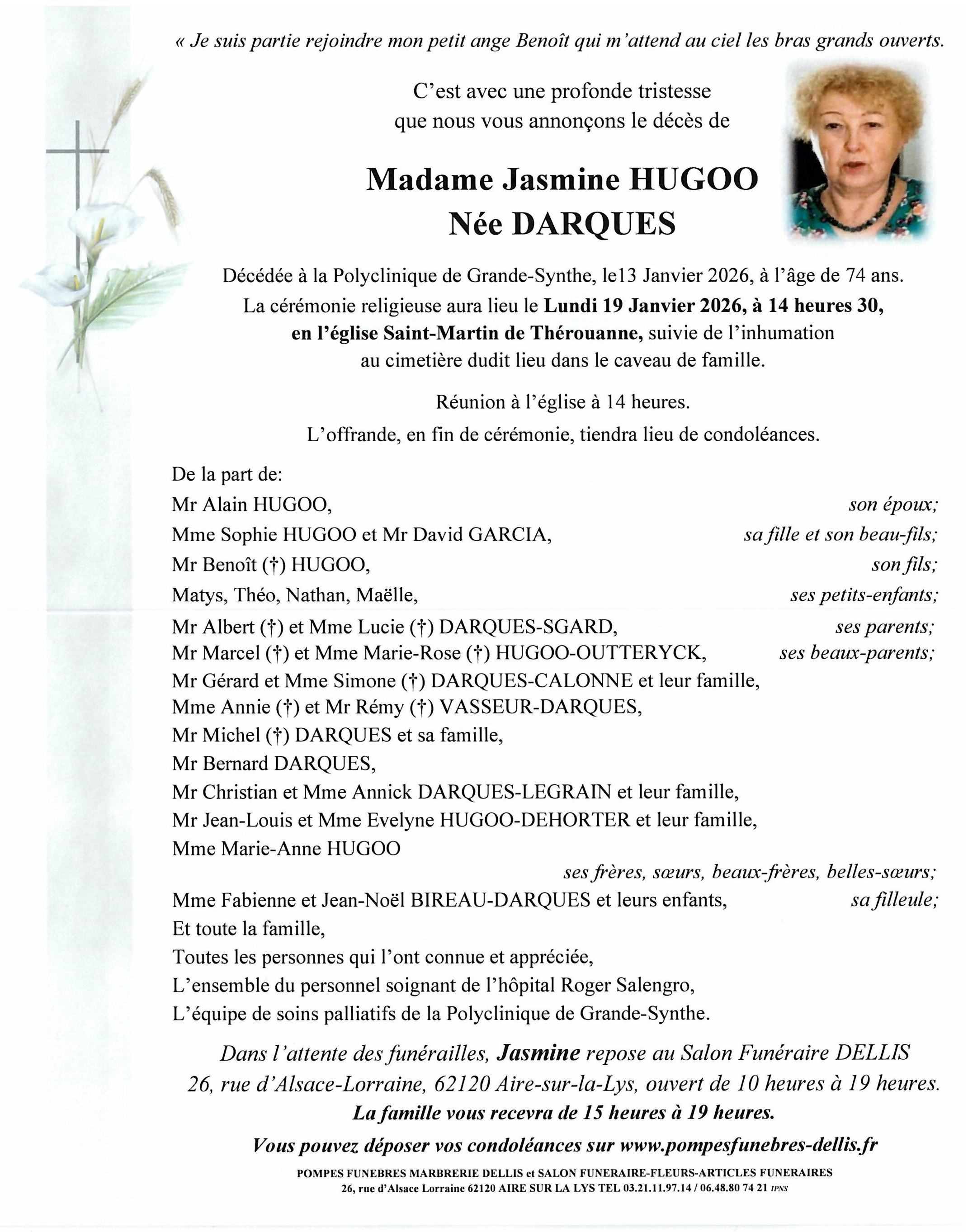 C’est avec une grande tristesse que nous vous annonçons le décès de Jasmine HUGOO survenu le mardi 13 janvier 2026 à Grande-Synthe. La cérémonie se déroulera le lundi 19 janvier 2026 à 14h30 à l’adresse suivante : Église Saint Martin - 62129 Thérouanne.