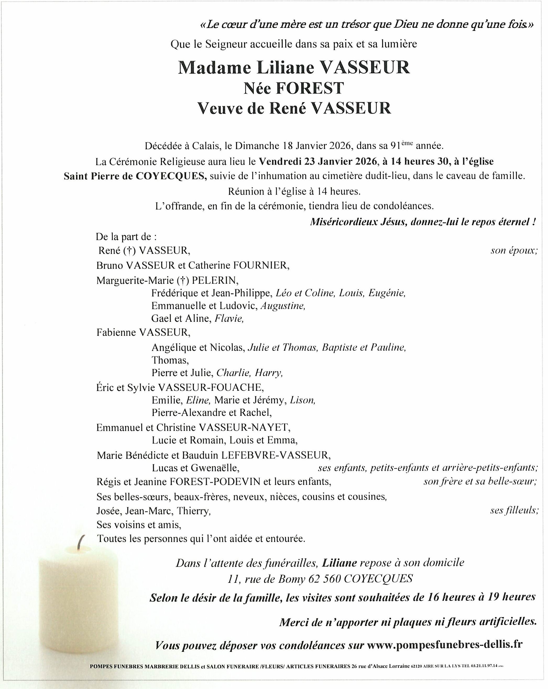C’est avec une grande tristesse que nous vous annonçons le décès de Liliane VASSEUR survenu le dimanche 18 janvier 2026 à Calais. La cérémonie se déroulera le vendredi 23 janvier 2026 à 14h30 à l’adresse suivante : Église Saint Pierre - 62560 Coyecques.