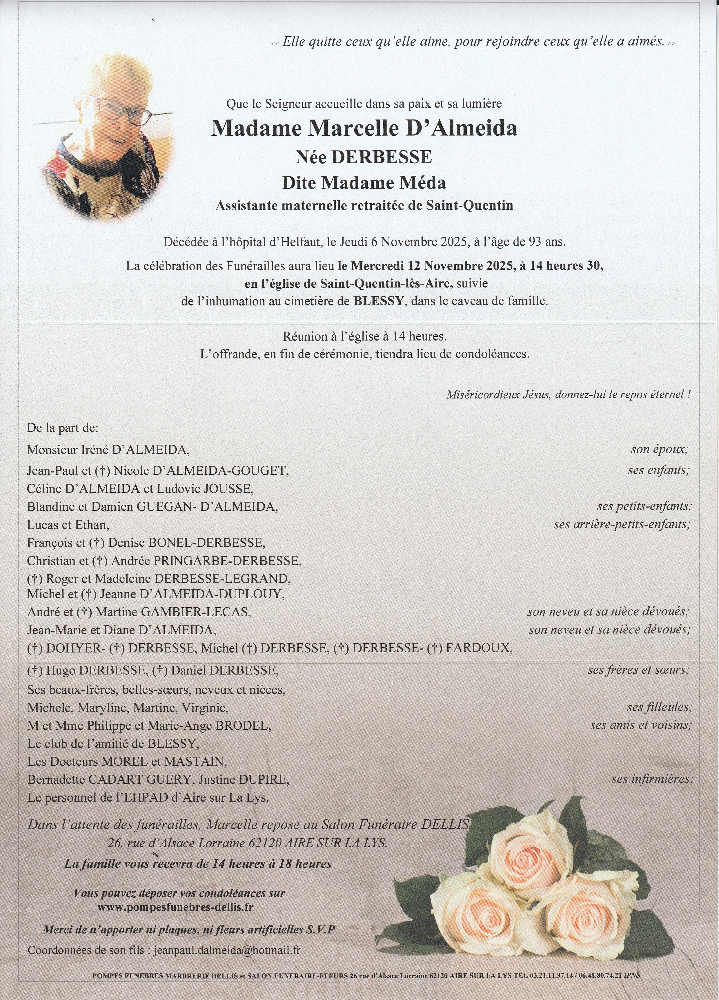 C’est avec une grande tristesse que nous vous annonçons le décès de Marcelle D'ALMEIDA survenu le jeudi 06 novembre 2025. La cérémonie se déroulera le mercredi 12 novembre 2025 à 14h30 à l’adresse suivante : Église Saint Quentin À Saint Quentin - 62120 Aire-sur-la-Lys.