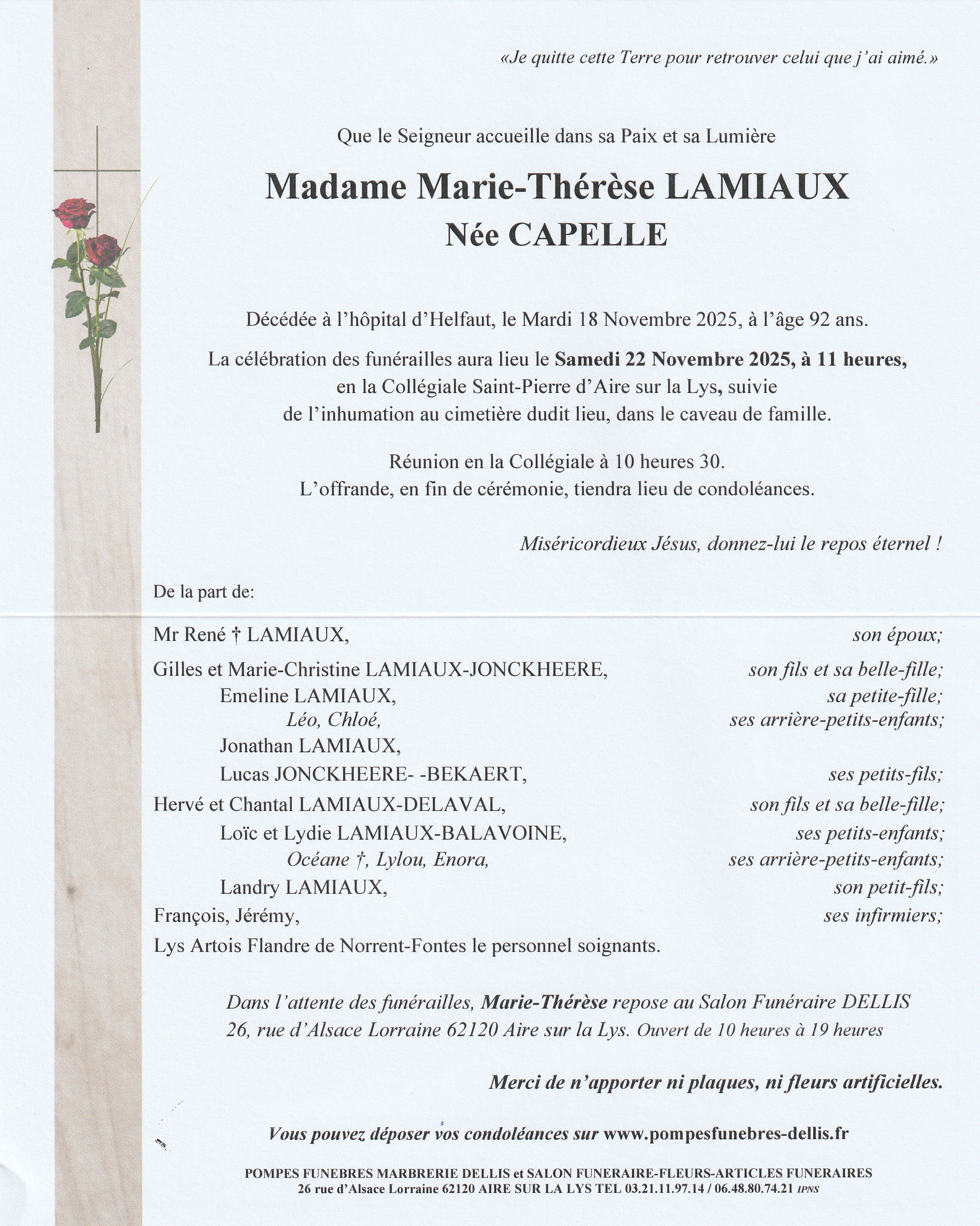 C’est avec une grande tristesse que nous vous annonçons le décès de Marie-Therese LAMIAUX survenu le mardi 18 novembre 2025 à Helfaut. La cérémonie se déroulera le samedi 22 novembre 2025 à 11h00 à l’adresse suivante : Collégiale Saint-Pierre - Place St Pierre - 62120 Aire-sur-la-Lys.