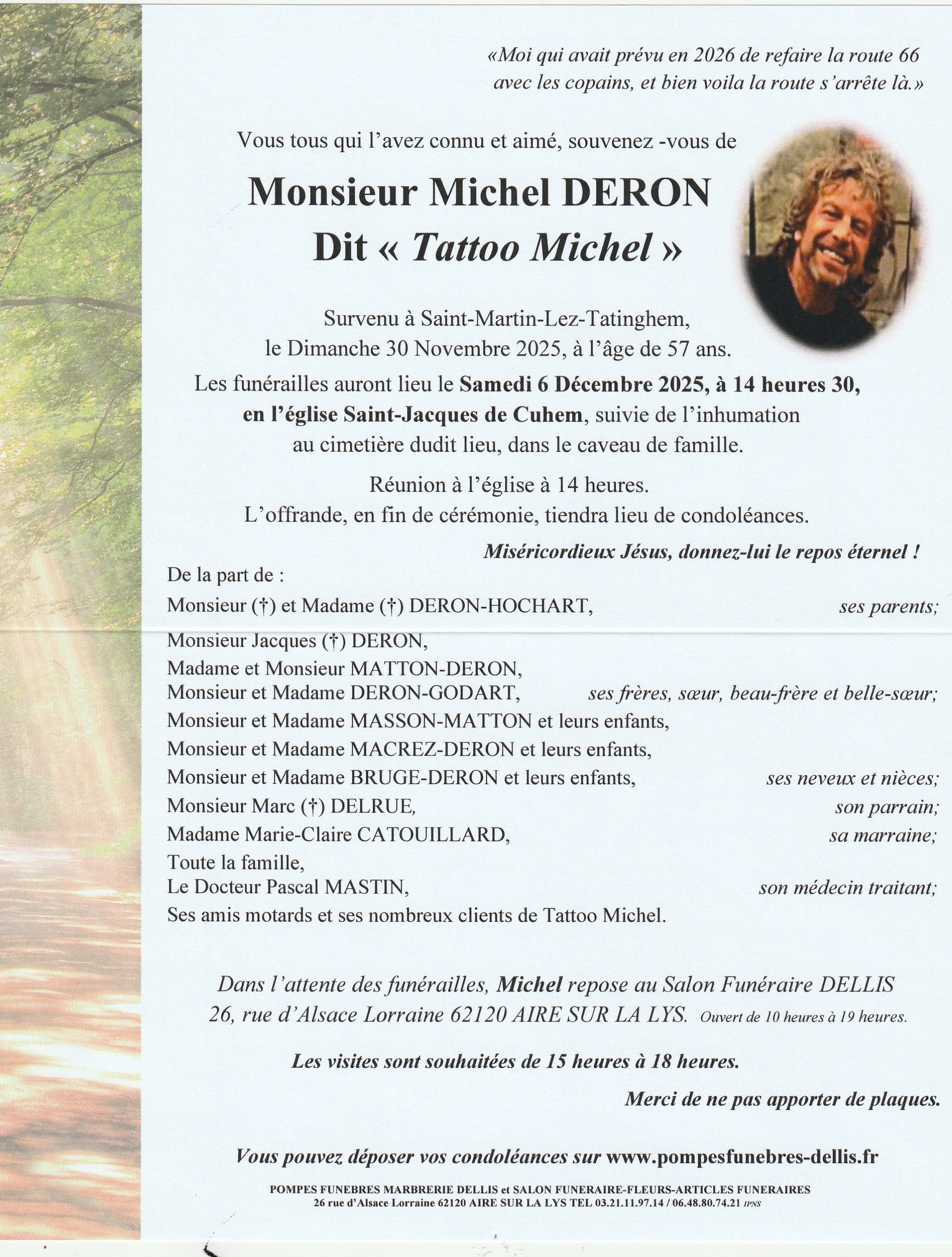 C’est avec une grande tristesse que nous vous annonçons le décès de Michel DERON survenu le dimanche 30 novembre 2025 à Saint-Martin-lez-Tatinghem. La cérémonie se déroulera le samedi 06 décembre 2025 à 14h30 à l’adresse suivante : Eglise Saint-Jacques - Rue de l'Église - 62960 Cuhem, hameau de Fléchin.