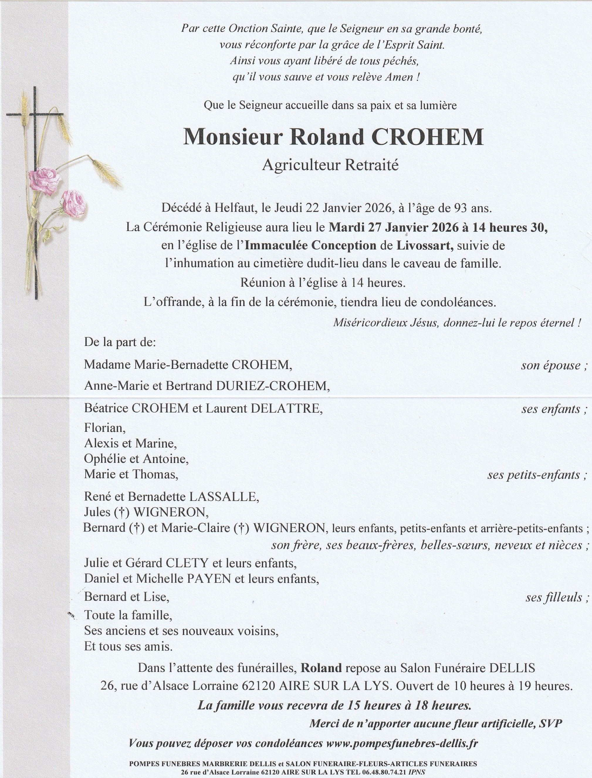 C’est avec une grande tristesse que nous vous annonçons le décès de Roland CROHEM survenu le jeudi 22 janvier 2026 à Helfaut. La cérémonie se déroulera le mardi 27 janvier 2026 à 14h30 à l’adresse suivante : Église Immaculée Conception À Livossart - rue de fauquembergues à LIVOSSART - 62960 Febvin-Palfart.